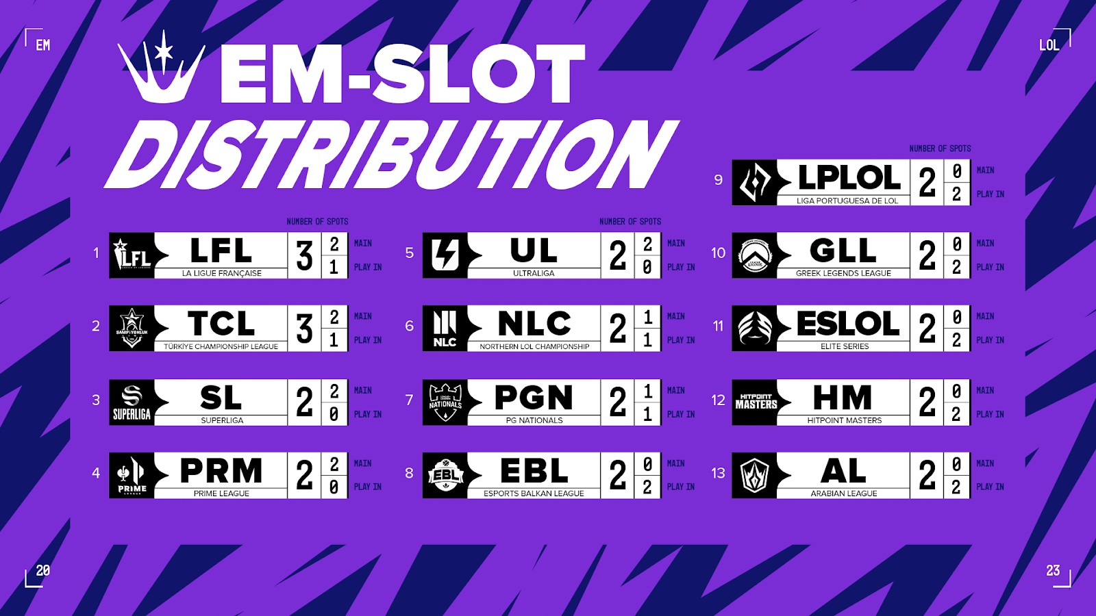 Voici la répartition du nombre d'équipes qui seront invitées dans chaque ligue pour l'EMEA Masters du Spring Split :