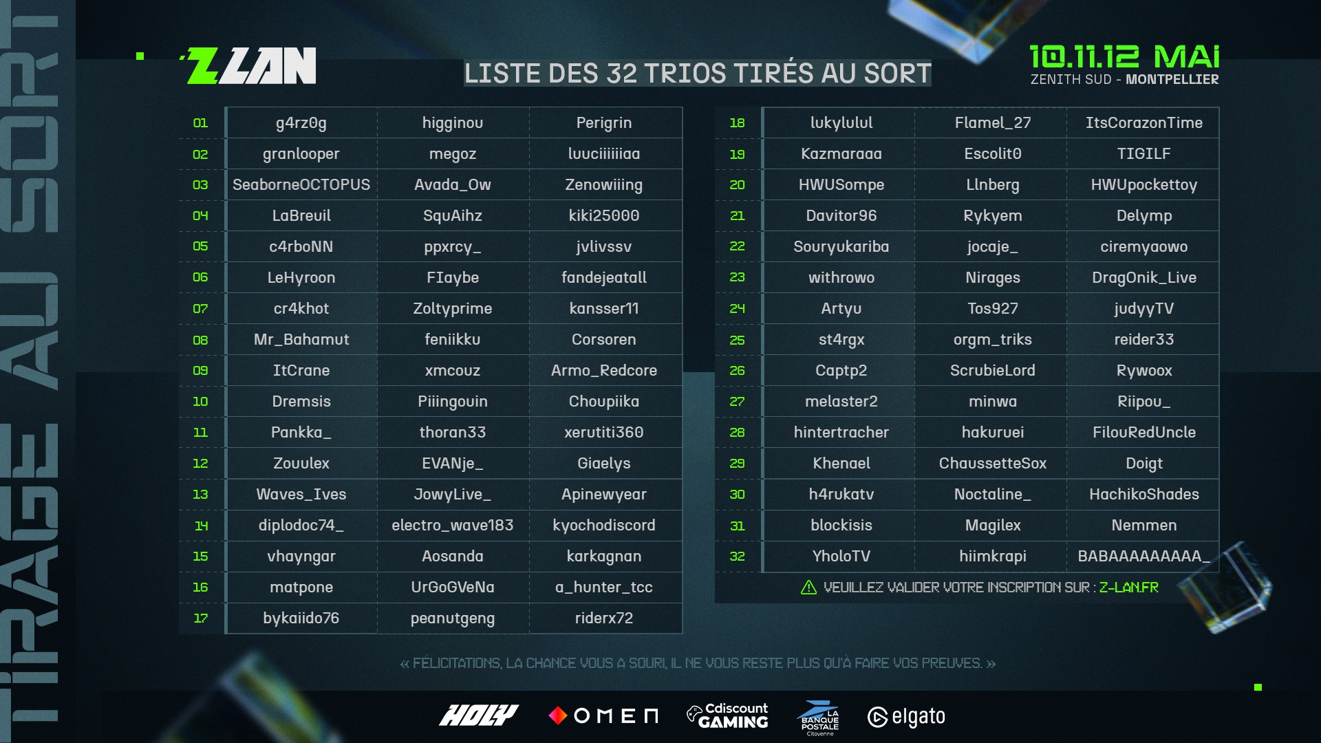 Au cours de ces dernières heures, ZeratoR a dévoilé liste des streamers et des 32 trios sélectionnés pour la Z LAN 2024. Comme précisé par les organisateurs de l'événement, si vous vous étiez inscrits et que vous ne vous trouvez pas dans cette liste, vous pouvez trouvez votre position dans la liste d'attente dans votre espace joueur sur le site de la Z LAN 2024.