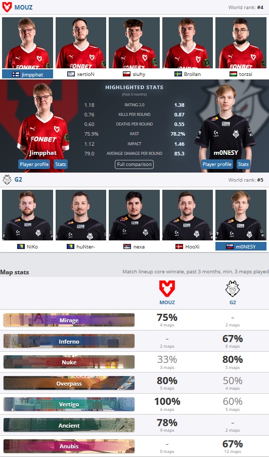 Le match devrait lui aussi être équilibré, mais gare au loup lorsque les G2 débarquent sur scène. En difficulté lors de l’Elimination stage, les G2 ont connu, soyons honnêtes, un parcours du combattant afin de se qualifier en playoffs : C9, NAVI, Ecstatic, Furia et VP. Les samouraïs ont dû batailler lors de chaque match, mais ont finalement réussi dans une grande adversité. Un ticket pour les quarts de major que les coéquipiers de NiKo n’avaient pas décroché depuis 2022, puisqu’éliminés prématurément à Paris. Sur scène, la famille Kovac et Monesy est en général très efficace et c’est bien cette adrénaline bien dosée avec l’expérience qui fait de G2 un très sérieux concurrent au titre final de ce major. Les bookmakers ont fait de Mouz les favoris, mais nous avons à coeur de penser que l’équation est bien plus compliquée à résoudre.