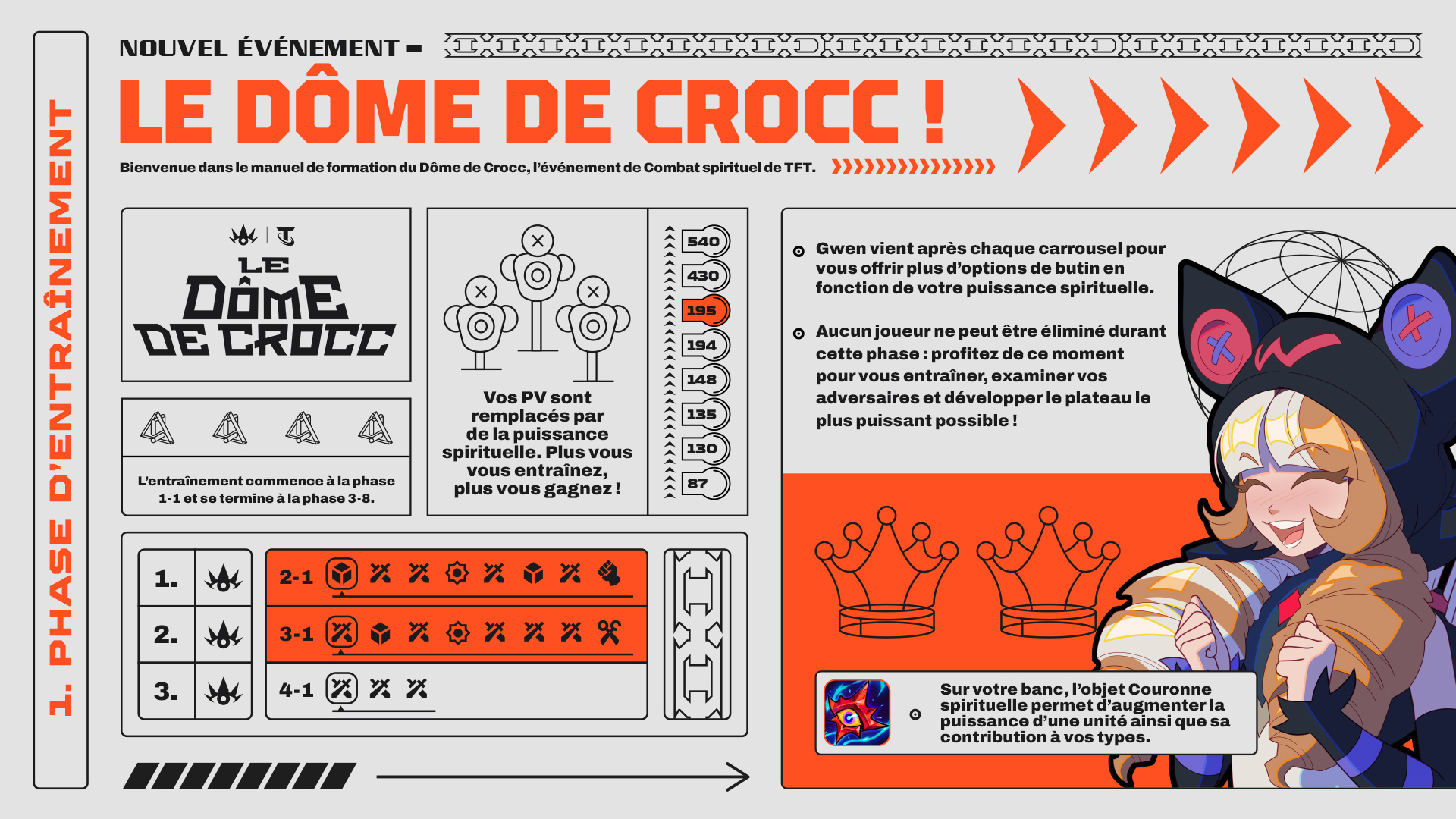Le Dôme de Crocc est le premier événement TFT a être entièrement disponible sur mobile. Vous y rencontrerez des champions Combattants spirituels ainsi que leurs entraîneurs perso (des petites légendes) alors qu'ils s'apprêtent à embarquer dans l'aventure du Dôme de Crocc.