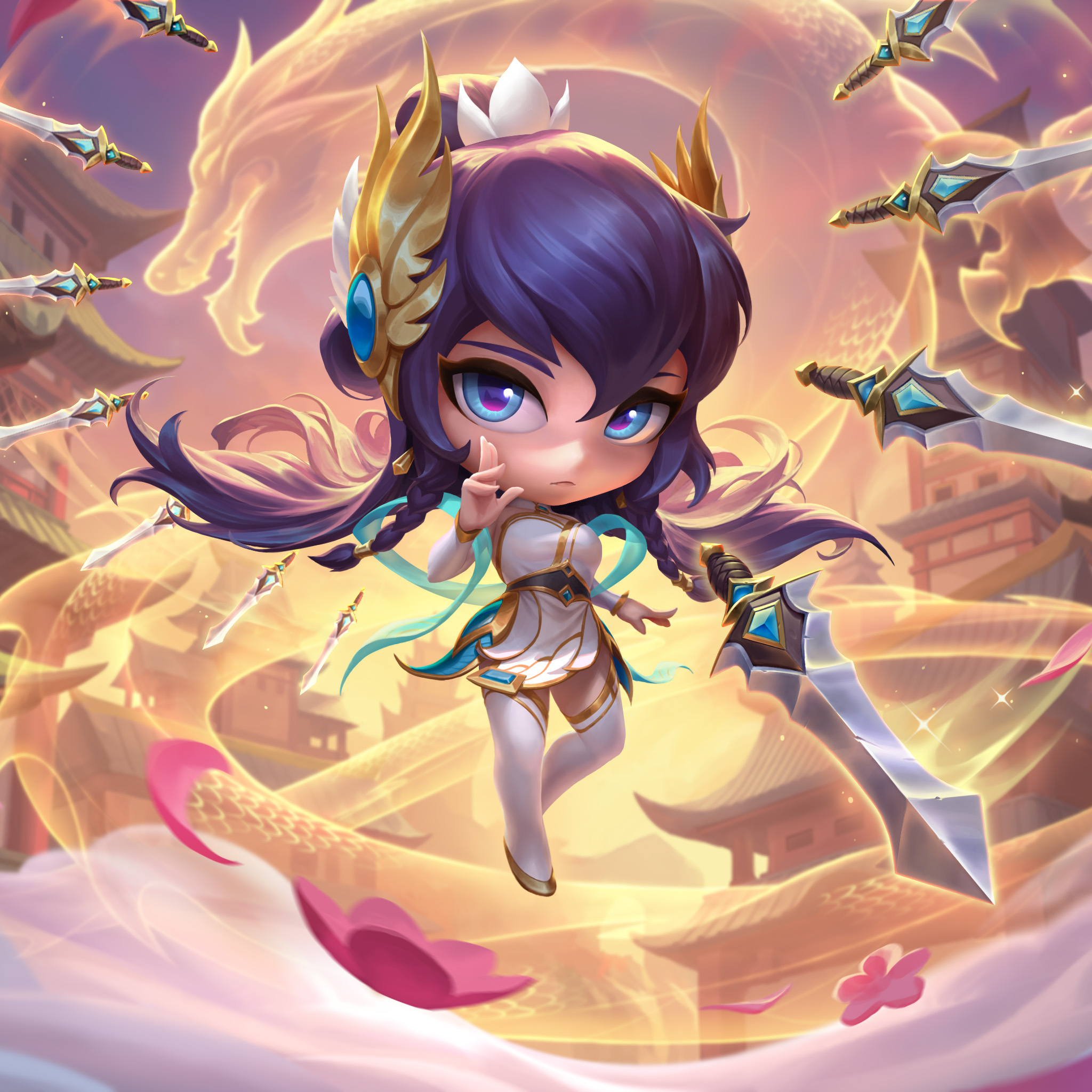 Puissante comme un dragon, mignonne comme un chibi, cette déesse exécute une danse des lames qui vous ira droit au cœur. Irelia à l'épée divine chibi sera disponible en tant que contenu étoilé des trésors TFT. Son coup de grâce fait allusion à ses légendaires aventures avec les dragons-rois.