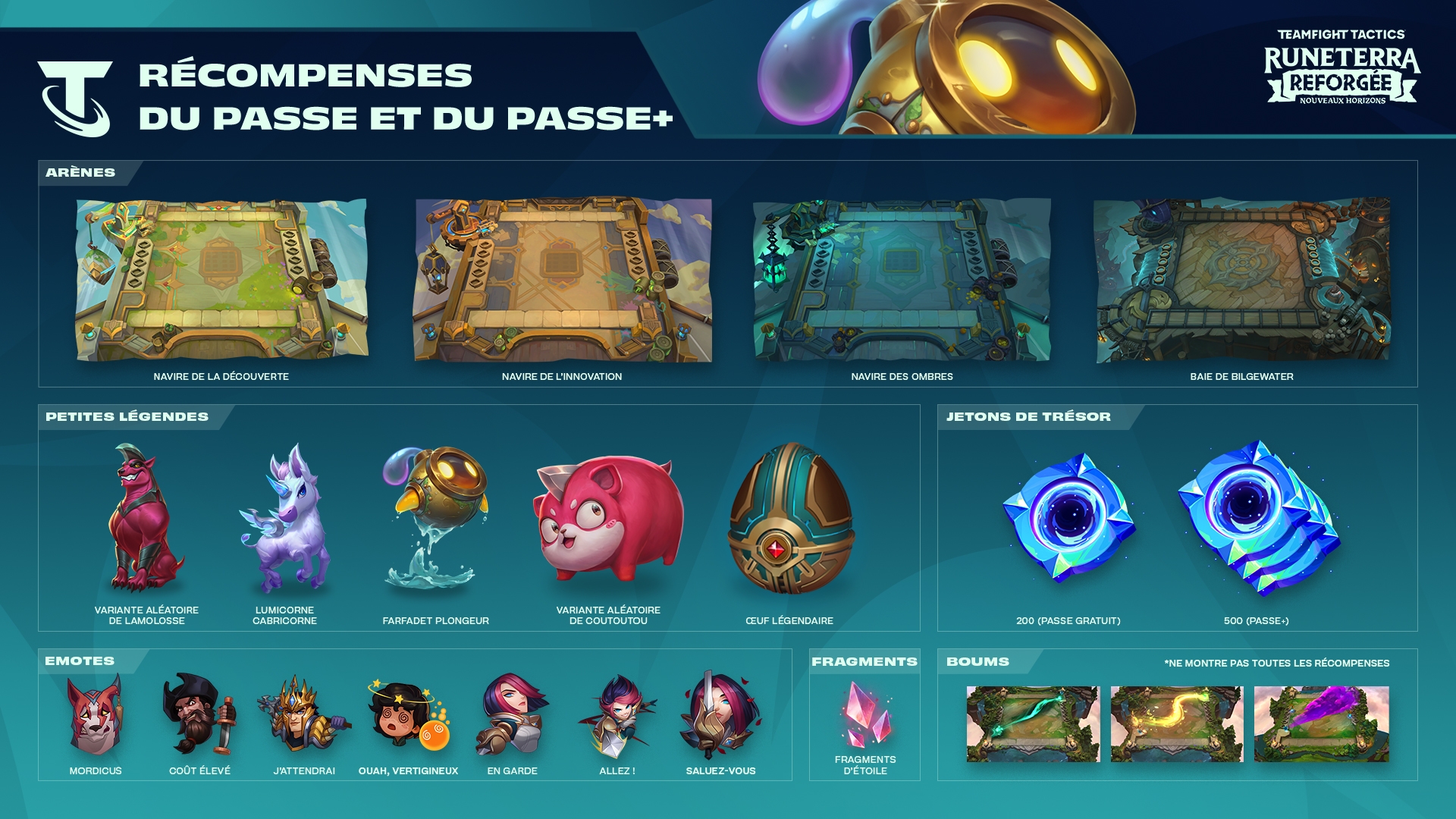Nous avons apporté des améliorations à la structure de notre passe Nouveaux horizons depuis la sortie du passe Runeterra reforgée. Les différences les plus notables pour le passe Nouveaux horizons sont les petites légendes supplémentaires et une récompense instantanée de jetons de trésor, mais il y a d'autres éléments encore qui valent qu'on s'y arrête ! Pour le montrer, nous avons fait un graphique bien pratique... Attendez que je le trouve... ici !