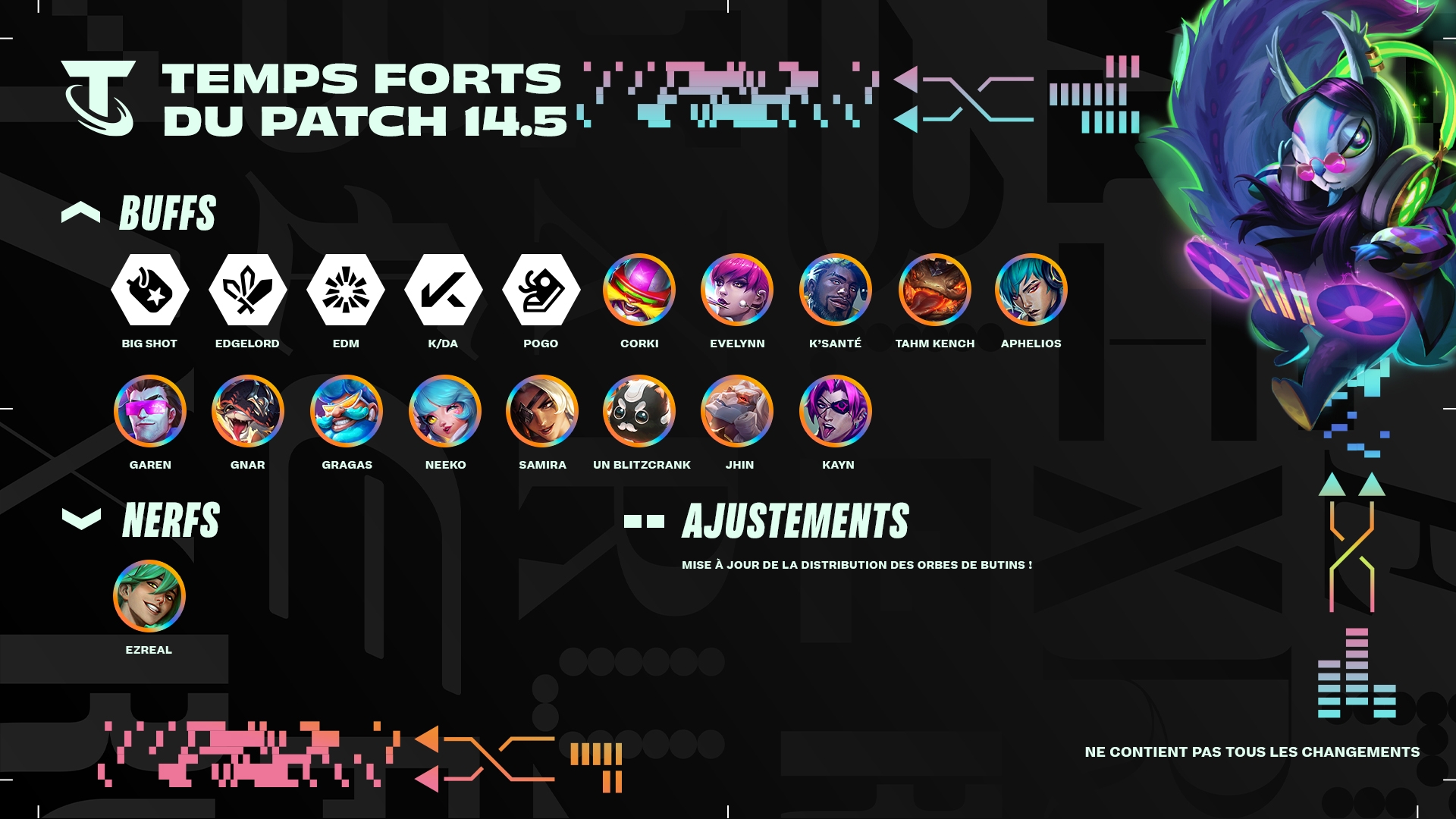 Dans ce patch, nous essayons de faire fonctionner des stratégies qui échouaient jusqu'ici. Des stratégies comme celle de K'Santé qui tue en un coup avec ses dégâts d'attaque ou celle du super tank Tahm Kench avec une Cape solaire ou une Étincelle ionique.