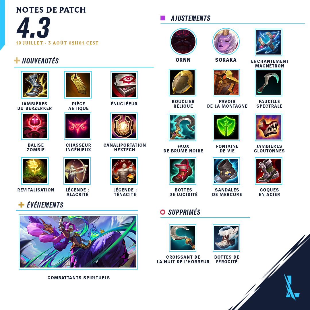Le patch 4.3 apporte avec lui le début d'une nouvelle saison classée ! Jouez des parties, atteignez vos objectifs et remportez le nouveau skin de saison classée : Jarvan IV basilic glorieux ! En plus de la nouvelle saison et du nouveau skin classé, nous avons également apporté des modifications au système de classement, ajouté un nouveau palier au-dessus de Challenger et quelque peu ajusté la file légendaire ! Vous pouvez en apprendre plus sur tous les changements du système classé dans notre blog Mise à jour du mode classé et FAQ !