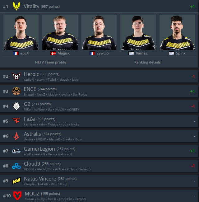 Le 26 juin dernier, la structure française avait abandonné la première place du classement HLTV au profit d'Heroic qui venait de terminer dans le Top 3 des Blast premier Fall groups quand Team Vitality se contentait d'un top 4-6.
